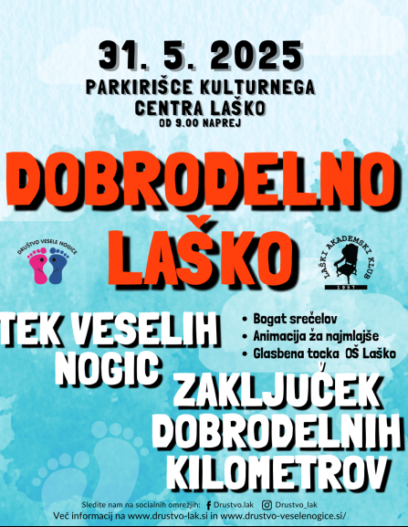 Od 9. ure naprej vas pričakujejo Laški akademski klub in društvo Vesele nogice. Za dobro voljo in animacijo bo poskrbljeno, vabljeni pa tudi k nakupu dobrodelnih srečk, s katerim boste prispevali k akciji Dobrodelni kilometri, kjer so zbrana sredstva namenjena šolskemu skladu osnovne šole Primoža Trubarja Laško.