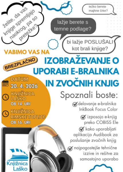 Digitalno branje vse bolj postaja del vsakdana – e-knjige, zvočne knjige in sodobni bralniki odpirajo nove možnosti za dostop do znanja in literature. Z namenom približati ta svet na preprost, praktičen in uporabniku prijazen način, Knjižnica Laško v sodelovanju z enotama v Rimskih Toplicah in Radečah v ponedeljek, 20. aprila 2026, pripravlja brezplačno izobraževanje, na katerem bodo udeleženci sodobne digitalne bralne pristope spoznali in jih tudi preizkusili v praksi.