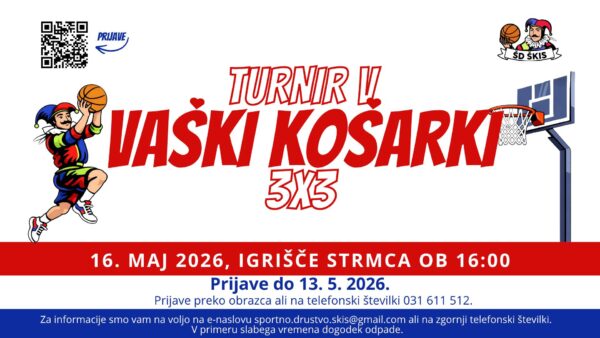 V soboto, 16. maja 2026, bo igrišče Strmca prizorišče vaškega turnirja v košarki 3 na 3, ki bo združil ljubitelje športa, tekmovalnosti in dobre družbe. Turnir se začne ob 16. uri, ekipe pa se lahko prijavijo na telefonski številki 031 611 512 ali preko spletnega obrazca; prijavnina znaša 20 evrov na ekipo in se poravna na dogodku.