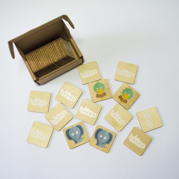 Igra spomin iz laminiranega lesa breze. Komplet zajema 24 tablic s tematskimi motivi živali v dimenzijah 40x40mm.