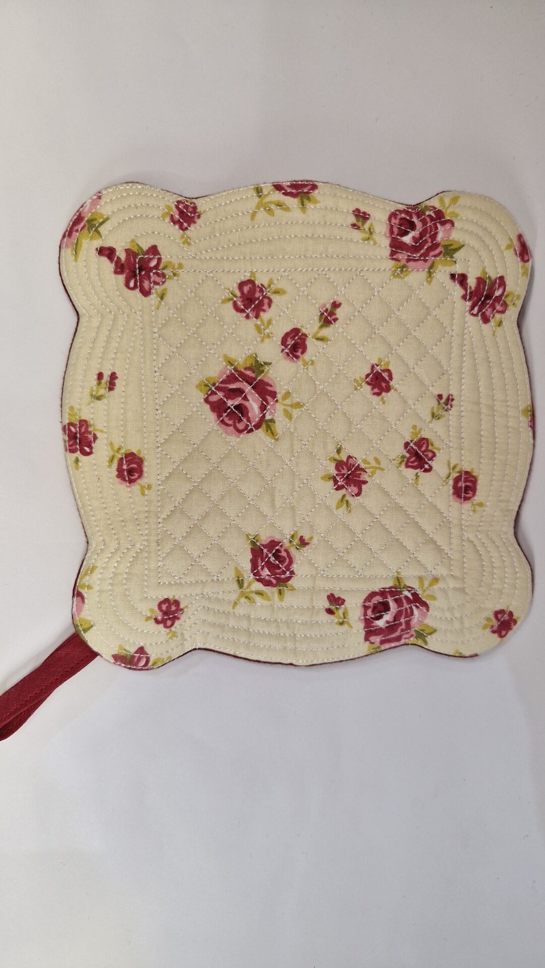 Unikatna kuhinjska oprijemalka, ročno izdelana in okrašena s cvetličnim vzorcem.