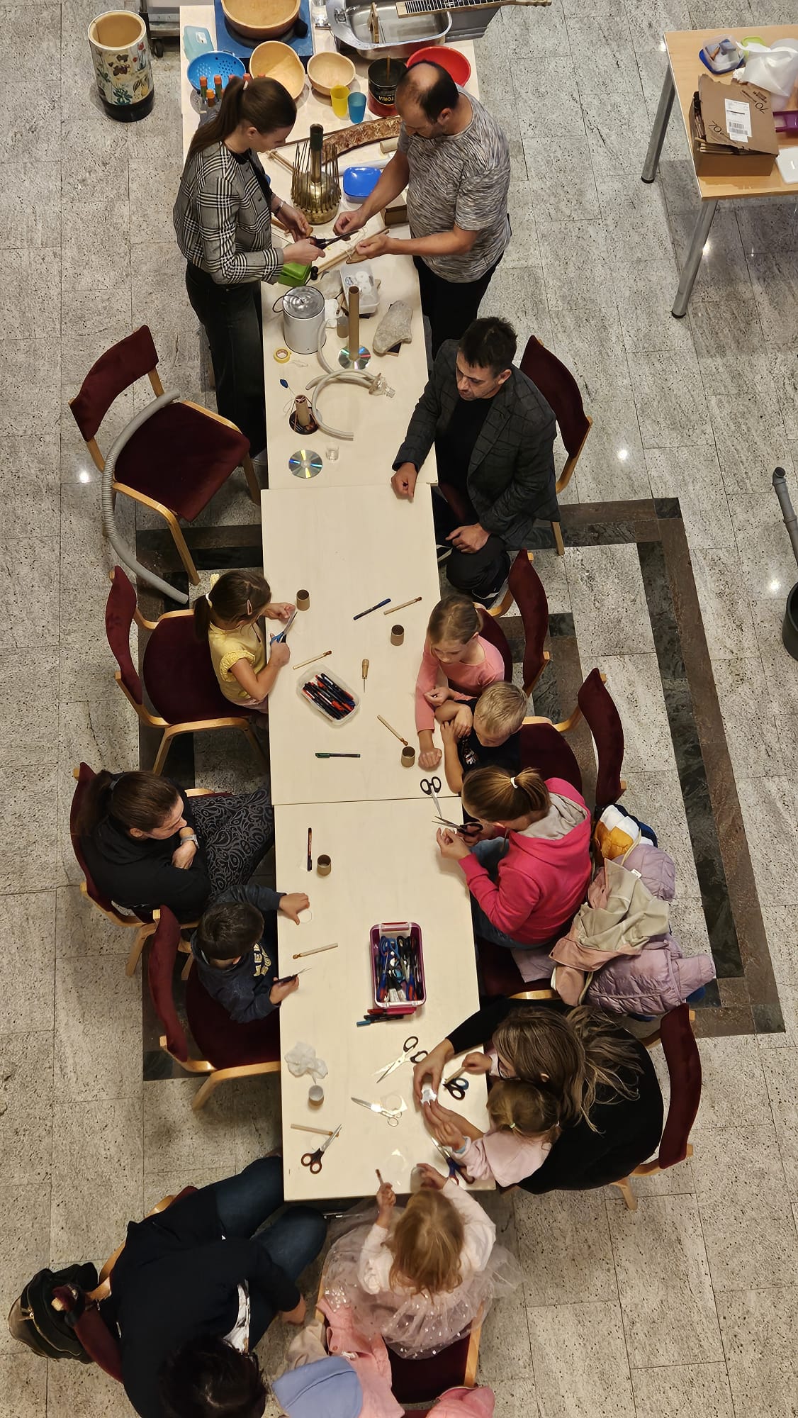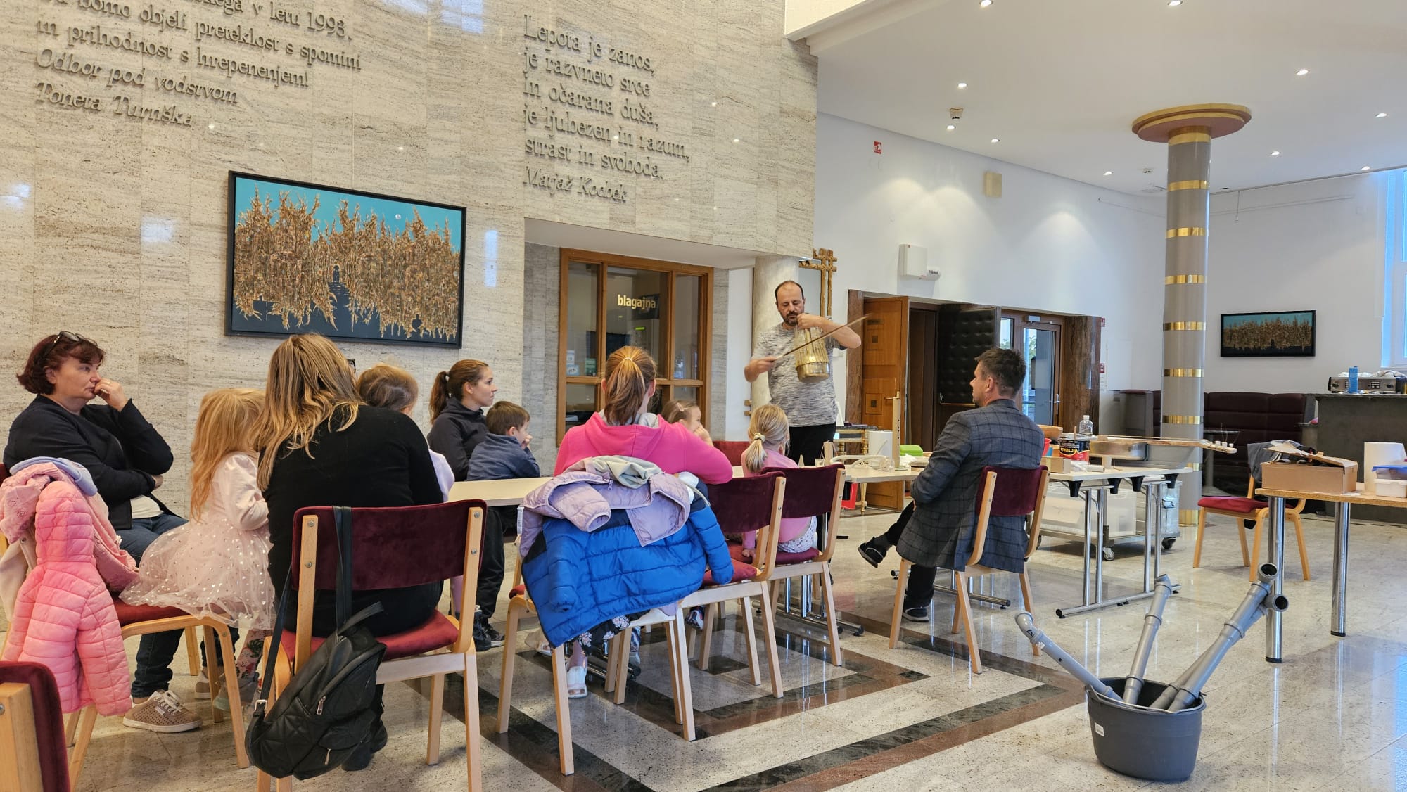 Predstava Blup! je s svojo igrivo in vizualno govorico otroke popeljala v svet domišljije, glasbe in zvokov. Delavnici, ki sta sledili predstavam, sta otrokom in staršem ponudili priložnost, da sami ustvarijo preproste glasbene instrumente iz vsakdanjih materialov ter s tem nadaljujejo raziskovanje zvoka in ustvarjalnosti tudi doma.